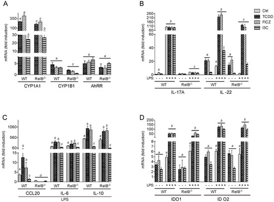 Effects of AhR ligands on CYP1A1, CYP1B1, AhRR, cytokines, and IDO expression in BMM. The mRNA expression of (A) CYP1A1, CYP1B1, and AhRR induced by AhR ligands in BMM is shown. BMM derived from wt or RelB−/− mice were treated with 1 nM TCDD, 100 nM FICZ, or 50 μM I3C for 24 h. Results from real-time PCR are presented as mean ± SEM and the y-axis represents mRNA expression level as fold increase above control. a significantly higher than BMM control, p < 0.05; b significantly lower than TCDD- or FICZ-treated wt or RelB−/− BMM, p < 0.05; c significantly lower than wt BMM, p < 0.05. (B) Expression of IL-17A and IL-22 in BMM derived from wt or RelB−/− mice treated with 1 nM TCDD, 100 nM FICZ, or 50 μM I3C for 24h in the absence or presence of LPS (50 ng/mL). a significantly higher than wt BMM control, p < 0.05; b significantly higher than FICZ- or LPS-treated wt BMM, p < 0.05; c significantly lower than wt BMM, p < 0.05. (C) Expression of CCL20, IL-6, and IL-10 in BMM derived from wt or RelB−/− mice treated with 1 nM TCDD, 100 nM FICZ, or 50 μM I3C for 24 h in the presence of LPS (50 ng/mL). a significantly higher than BMM control, p < 0.05; b significantly higher than LPS-treated BMM, p < 0.05; c significantly lower than LPS, TCDD, or FICZ-treated BMM, p < 0.05; d significantly lower than wt BMM, p < 0.05. (D) Expression of IDO1 and IDO2 in BMM derived from wt or RelB−/− mice treated with 1 nM TCDD, 100 nM FICZ, or 50 μM I3C for 24 h in the presence or absence of LPS (50 ng/mL). a significantly higher than BMM control, p < 0.05; b significantly higher than LPS-treated BMM, p < 0.05.