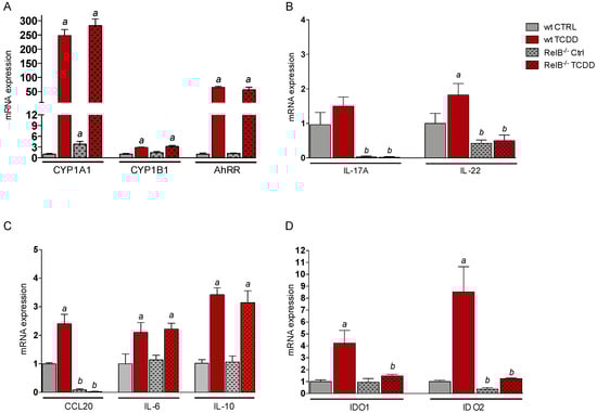 Effects of TCDD on CYP1A1, CYP1B1, AhRR, cytokines, and IDO expression in thymus of wt and RelB−/− mice. Male wt (n = 5) and RelB−/− mice (n = 5) were treated with 15 μg/kg TCDD for 24 h and expression of (A) CYP1A1, CYP1B1, and AhRR induced by TCDD is shown. a significantly higher than wt control, p < 0.05. (B) Expression of IL-17A and IL-22 induced by TCDD is shown. a significantly higher than wt control, p < 0.05. b significantly lower than wt control, p < 0.05. (C) Expression of CCL20, IL-6, and IL-10 induced by TCDD is shown. a significantly higher than wt control, p < 0.05. b significantly lower than wt control, p < 0.05. (D) Expression of IDO1 and IDO2 induced by TCDD is shown. a significantly higher than wt control, p < 0.05. b significantly lower than wt control or TCDD-treated wt, p < 0.05. a significantly higher than wt control, p < 0.05. b significantly lower than wt control or TCDD-treated wt, p < 0.05.