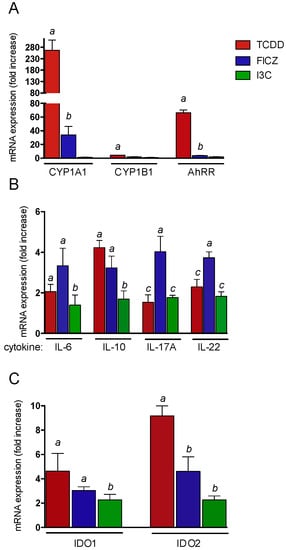The highest mRNA levels of IDO1 (6.9-fold) and IDO2 (9.2-fold) were found in thymus of TCDD-treated mice (Figure 3C). The effect of I3C was significantly lower on IDO1 compared to that of TCDD and FICZ. The mRNA expression of IDO2 was significantly less induced by FICZ and I3C compared to by TCDD.