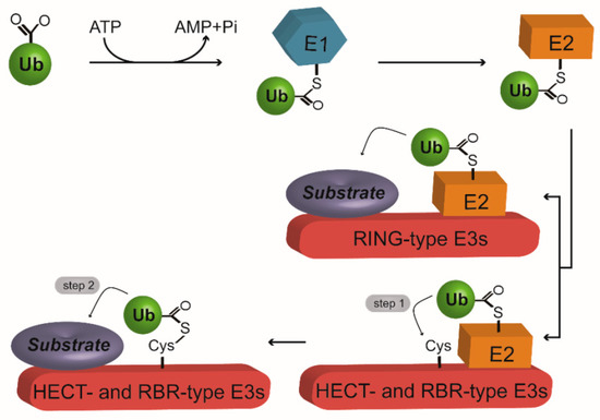 The ubiquitination machinery. Ubiquitination is initiated by E1-mediated ubiquitin (Ub) activation. Next, Ub is transferred to E2 to form an E2-Ub conjugate. At the final step, E3 mediates isopeptide bond formation between the Ub and the substrate. Really interesting new gene (RING)-type E3s serve as a scaffold to directly transfer the Ub from E2 to the substrate. On the other hand, homologous to E6-AP COOH terminus (HECT)- and RING between RING (RBR)-type E3s require a two-step reaction to achieve Ub ligation with the substrate. In the first step, Ub is transferred from E2 to E3, producing an E3-Ub thioester intermediate. At the second step, Ub is finally handed over to the substrate. Arrows represent the next steps during the process of ubiquitination.