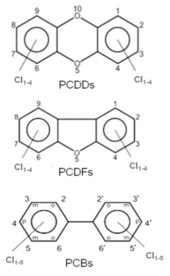 These halogenated organic POPs mainly belong to three families of molecules, i.e., polychlorinated dibenzo-p-dioxins (PCDDs), polychlorinated dibenzofurans (PCDFs) and polychlorinated biphenyls (PCBs); their molecular structures are presented in Figure 1.