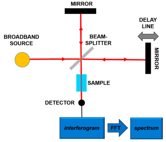 The most frequent use of the absorption spectroscopy in Mid-IR lies in the identification of substances through their characteristic molecular vibrations. Furans and dioxins, and in general, molecules with a similar structure, are not in gaseous phase at room temperature, and high temperatures (more than 550 °C) are needed to perform gaseous spectroscopy. However, in order to work at room temperature, it is possible to carry out spectroscopy in liquid phase, dissolving the target molecules in a Mid-IR transparent solution [18,19]. In both gaseous and liquid spectroscopy, the detected absorption peaks are tens of cm−1 wide. In order to detect these bands, techniques and components spanning a wide frequency range are needed. In this framework, a consolidated technique is Fourier-Transform Infrared Spectroscopy (FT-IR) [32]. In this scheme, sketched in Figure 2, using a broadband source, typically a lamp, an interferometric pattern is recorded from the light interacting with the sample. By using the Fourier Transform approach, it is possible to reconstruct the absorption spectrum of the substance under analysis.