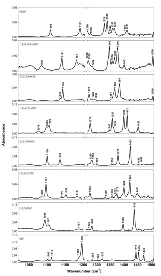 FT-IR spectra of PCDFs and dibenzofuran (DBF). Reprinted with permission from [19], copyright 2014.