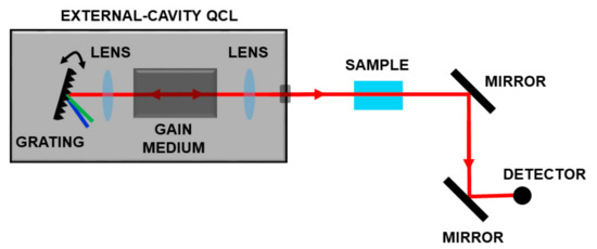 In the last ten years, the availability of broadband tunable QCLs in the range 4–12 µm enabled the development of optical schemes for measuring complex molecules. These sources, based on a moving external grating, which closes the laser cavity, allow wavelength selection and high gain for the active media on a very large frequency range as sketched in Figure 5.