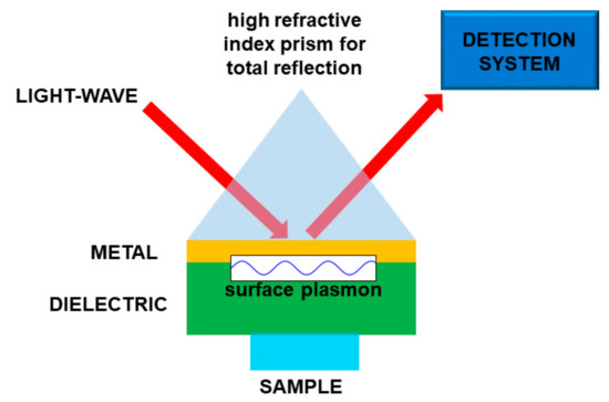 Basically, the interaction between the target molecule and the structure (nanoparticles, nanomaterial, fiber sensors), provided with plasmonic resonances, produces a relevant effect in absorption, fluorescence enhancement, or frequency shifting of a laser beam. In the latter case, when the molecule is on the plasmonic structure, the change of physical conditions at the interface produces some changes in the plasmon coupling, namely, an easily detectable resonance shift. In this way it is possible to obtain a very sensitive sensor, tailored onto a specific target molecule or molecular class. In most cases, the plasmonic sensor needs to be functionalized to enable the sticking of the molecule to the structure, so making the detection possible. A scheme of a kind of plasmonic sensor is reported in Figure 8.