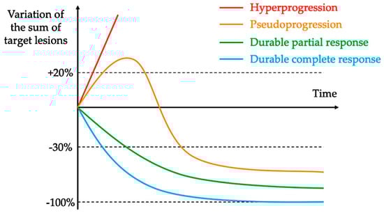 Several assessments of hyperprogression have been reported in retrospective studies to evaluate its incidence, and are summarized in Table 1. In a retrospective multi-tumor cohort of 131 patients treated in phase 1 studies with anti-PD-1 or anti-PD-L1, Champiat et al. extrapolated the tumor volume, assuming it could be approximated by a sphere with a diameter equal to the sum of larger diameters of target lesions (according to RECIST), and studied its evolution over time, with two pretherapeutic computed-tomography scans (CT scan), one 8 weeks before baseline CT scan and one at baseline, and one after initiation of immunotherapy, to estimate the tumor growth rate (TGR) reported as the percentage increase in tumor volume per month [14]. An 8-week washout period of antitumoral treatment was required before initiation of immunotherapy to use each patient as his/her own control. The authors defined hyperprogressive patients as having a RECIST progression at the first evaluation and at least two-fold TGR increase between the pretherapeutic and the immunotherapy period, and observed a rate of 9% of hyperprogressions (Figure 3).