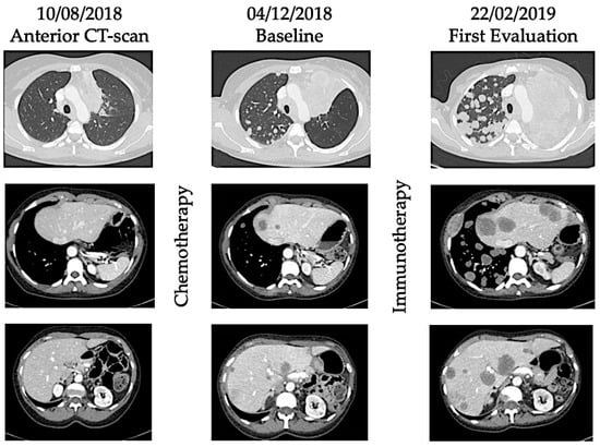 Illustration of hyperprogression under immunotherapy. A 53-year-old female patient with metastatic (lung) submandibular gland epidermoid carcinoma was treated in third line with weekly Methotrexate. After 4 months, patient experienced disease progression with appearance of lung, hepatic, and bone metastases. As fourth line, she received Nivolumab, an anti-PD-1 inhibitor. After 4 injections, she presented with major dyspnea with massive disease progression on computed-tomography (CT) scan. She died 64 days after immunotherapy initiation.
