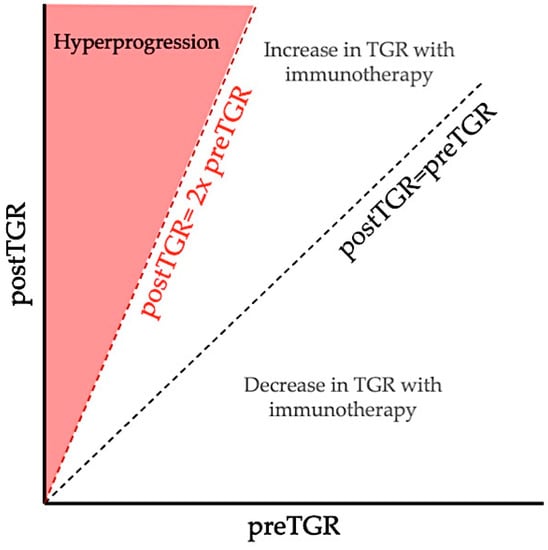 Definition of hyperprogression by Champiat et al. based on TGR variation. Comparison between pre-immunotherapy TGR (preTGR), computed with the anterior and baseline CT scan, and immunotherapy TGR (postTGR), computed with baseline CT scan and first evaluation during immunotherapy. Champiat defined hyperprogression as a RECIST progression at the first evaluation and at least two-fold TGR increase between pre-immunotherapy and immunotherapy period [14].