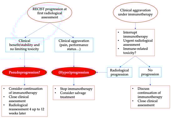 ICI are now commonly used in oncology, and implicate new ways to manage patient toxicities and response. New radiological criteria have been developed to include the concepts of unconfirmed progressive disease and pseudoprogression (Table 2), but RECIST evaluation remains the main criteria used in current practice and in clinical trials. Radiological evaluation alone is not enough to distinguish pseudoprogression from hyperprogression, since even the apparition of new lesions can be part of pseudoprogression with the immunotherapy-specific radiological criteria [11,12,13]. Furthermore, as described by Ferrara et al., a pure radiological definition of hyperprogression could lead to a misclassification of pseudoprogression as hyperprogression [18]. Thus, a clinical evaluation is essential to interpret radiological responses under immunotherapy. While immunotherapy could be maintained in cases of patients with radiological progression but clinical benefit in the hypothesis of pseudoprogression, patients with clinical aggravation, such as pain worsening or ECOG performance status decrease, or rapid progression should benefit, by contrast, from an earlier radiological evaluation (Figure 4). Patients experiencing clinical presentation suggesting hyperprogressive disease should not receive further ICI perfusions, should be reassessed early, and should be switched to another potential efficient treatment, such as salvage chemotherapy. Treatment should be interrupted in cases of hyperprogression, and patients should be reassessed to balance the likelihood of potential pseudoprogression, which is rare. We strongly recommend in cases of rapid progression to interrupt immunotherapy and rapidly re-assess the patient, which might allow switching to another treatment in patients with a still good clinical condition.