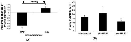 Hyaluronan (HA) from HA synthase (HAS)2 affects peroxisome proliferator-activated receptor gamma (PPARγ) transcripts. Subcutaneous preadipocytes/fibroblasts (PFs) (n = 4) were cultured until ~90% confluent, treated with HAS siRNA (A) or a hyaluronan-enriched supernatant (B) from HAS1 or HAS2 stable expressing HEK293 cell lines in a serum-free medium for 24 h, compared to scrambled siRNA or a supernatant from HEK293 cells with empty vector controls, respectively. PPARγ transcripts were measured by Q-PCR. Results are expressed as increased or decreased percentage changes in comparison to the controls (A) or transcript copy number (TCN) per 1000 copies of housekeeper gene (adenosine phosphoribosyl transferase, APRT) (B). Histograms = the mean ± SEM of all samples studied. * p < 0.04; ** p ≤ 0.01.