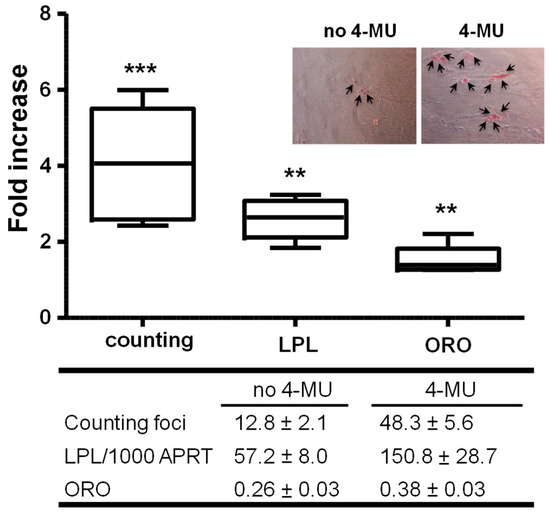 We then examined the effect of 0.1 mM 4-MU on in vitro-induced adipogenesis in further samples (n = 6) using morphological assessment, semi-quantitative ORO staining or QPCR measurement of transcripts for LPL. The results are summarised in Figure 2 and show that adipogenesis was significantly enhanced (1.5- to 4-fold) in PFs irrespective of the evaluation method.