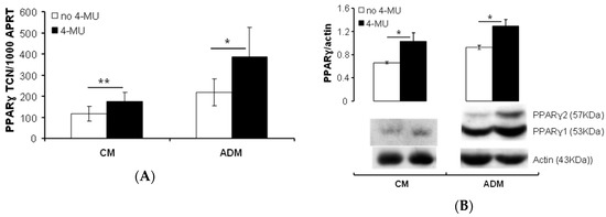 Enhanced PPARγ expression by 4-MU treatment. Confluent primary subcutaneous PFs were cultured in ADM or CM with/without 4-MU for 22 days. Total RNA and nuclear protein were prepared. (A) PPARγ transcripts (CM, n = 4; ADM, n = 8) and (B) nuclear protein (n = 4) were analysed by QPCR and Western blotting, respectively. Results are expressed as transcript copy number (TCN) per 1000 copies of housekeeper gene (adenosine phosphoribosyl transferase (APRT)) for QPCR, or PPARγ/actin for protein expression. Histograms = the mean ± SD (A) or SEM (B) of all samples studied. Two-tailed t-test has been used. * p < 0.04; ** p ≤ 0.01.