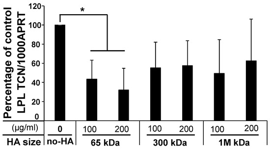 Decreased percentage of adiogenesis by LMW-HA treatment. LPL (terminal adipogenesis marker) was analysed by treatment of hyaluronan fragments (41–65 (65 kDa), 151–300 (300 kDa) and 1010–1800 (1 MDa)) in ADM compared to the no-HA control. Results are given as a percentage of the no-HA control (control as 100%) in LPL Transcript Copy Number (TCN)/1000 APRT. * p < 0.05.