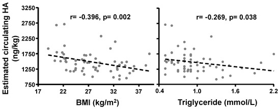 Negative correlations of estimated circulating HA per adipose tissue and BMI/triglyceride. The scatterplot showing the relationship between blood volume-adjusted circulating HA (ng/kg) and BMI (kg/m2), or triglyceride (mmol/L). Statistically significant Spearman’s correlations have shown between baseline characteristics and circulating HA.