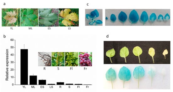 Leaf senescence seriously affects photosynthesis and nutrient assimilation, and subsequently influences the yield and quality of grapes [,]. To confirm the role of the DRL1 gene in leaf development, we determined its transcript abundance at different stages of leaf development in grapevine. The expression level of the DRL1 gene was highest in the young leaf, decreasing with leaf age, and reaching the lowest level in leaves at late senescence (Figure 1a,b). In other tissues, including root, stem flower, and fruit, the transcripts of DRL1 kept to a low level (Figure 1b). Transgenic tobacco plants were generated, which expressed the GUS protein driven by the promoter of the DRL1 gene. A histochemical staining analysis showed that the DRL1 gene was mainly expressed in the stem and leaves (Figure 1c). In 14-day-old transgenic plants, more GUS protein was detected in the young leaf, which showed dark blue, whereas less GUS protein was detected in the old leaf, which showed only slightly blue. A similar result was obtained in 4-week-old transgenic plants (Figure 1d). These results show that the DRL1 gene may be involved in leaf senescence.