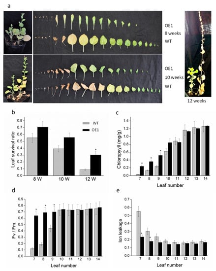 DRL1-over-expression delayed leaf senescence. (a) The phenotype of transgenic and wild-type (WT) tobacco plants at 8, 10, and 12 weeks. (b–e) Physiological analyses of leaves from transgenic plants. Leaf survival rate (b), chlorophyll concentration (c), ion leakage (d), and Fv/Fm ratio (e) were measured in WT and transgenic plants of the same age. Bars represent mean ± SD. Significant difference from the WT was confirmed by Tukey’s test [,] (* p < 0.05).