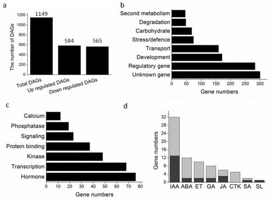 DRL1 regulates various genes associated with leaf senescence. (a) The number of DEGs in DRL1-overexpressing transgenic plants compared with wild type plants. (b) Classification of DAGs based on Gene Ontology (GO) annotation. (c) Classification of regulatory genes. (d) Classification of hormone-related genes (gray columns represent up-regulated genes, black columns represent down-regulated genes).