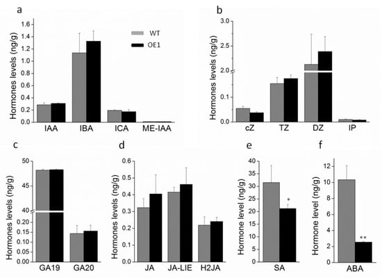 The concentrations of the hormones auxins (a), cytokinins (b), gibberellins (c), jasmonic acid (d), salicylic acid (e), and abscisic acid (f) in DRL-overexpressing transgenic and wild-type tobacco leaves. Bars represent mean ± SD. Significant difference from the WT was confirmed by Tukey’s test (* p < 0.05 and ** p < 0.01).