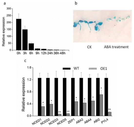 The expression of abscisic acid metabolism-related genes in WT and DRL1-overexpressing transgenic plants. (a) The expression of DRL1 in grapevine following ABA treatment. (b) GUS staining in leaves of PDRL1-GUS transgenic tobacco plants under ABA treatment. Six-day-old tobacco seedlings were treated (n = 60). (c) Expression analysis of ABA biosynthesis- and regulation-related genes in wild-type and DRL1-overexpressing transgenic tobacco plants. Asterisks represent statistically significant differences between wild-type and transgenic plants: * p < 0.05 and ** p < 0.01.