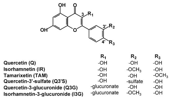 - Manach, C.; Texier, O.; Regerat, F.; Agullo, G.; Demigne, C.; Remesy, C. Dietary quercetin is recovered in rat plasma as conjugated derivatives of isorhamnetin and quercetin. J. Nutr. Biochem. 1996, 7, 375–380. [Google Scholar] [CrossRef]