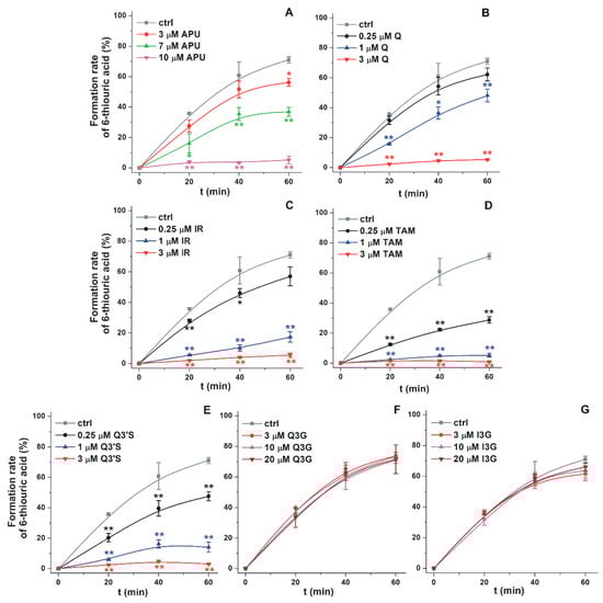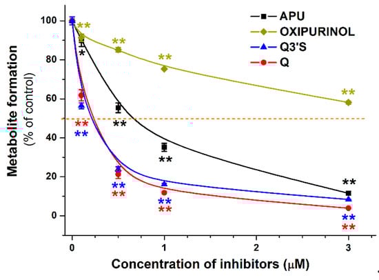 2.3. Inhibitory Effects of Q, Q3′S, APU, and Oxipurinol on XO-Catalyzed Hypoxanthine Oxidation