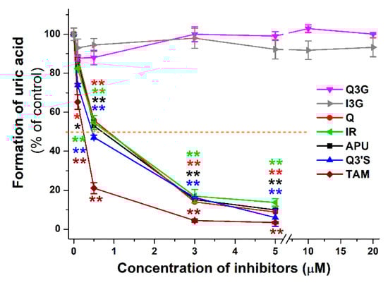 2.2. Inhibitory Effects of Q and Its Human Metabolites on XO-Catalyzed Xanthine Oxidation