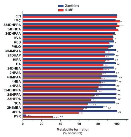 2.4. Inhibitory Effects of the Microbial Metabolites on XO-Catalyzed 6-MP and Xanthine Oxidation