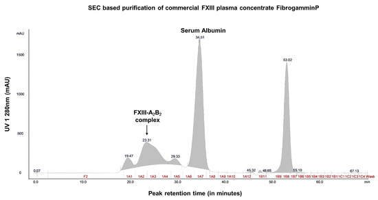 Size exclusion chromatography revealed that the crude fractions of FibrogamminP contain majorly coagulation FXIII-A2B2 (MW 320 kDa) (retention at 23.31 min), along with albumin (MW 66 kDa) (at 34.51 min), alpha-2-macroglobulin (MW 725 kDa) (at 19.47 min), and complement Factor H (MW 155 kDa) (at 29.33 min) eluted at different retention times (Figure 1, Figure 2 and Figure S1). The peak corresponding to the molecular weight of FXIII-A2B2 was collected and re-run to generate a single monodispersed homogenous peak. Upon analysis, this peak showed the co-presence of complement Factor H and albumin, in addition to FXIII-A2B2 (Figure 1, Figure 2, Figures S1 and S3, and attached MS data files (peptide summary reports) in the Supplementary Information).