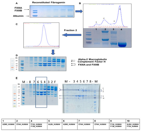 Plasma FXIII concentrate (FibrogamminP) analysis. (A) The preliminary SDS-PAGE gel run of the commercial FXIII plasma concentrate “FibrogamminP” reconstituted in water. The fastest running band corresponds to human serum albumin, which is a known constituent of FibrogamminP. (B) Mass based separation of reconstituted FibrogamminP run on a SEC column (Superdex 200 PC 3.2/30 column, running buffer: 20 mM Tris HCl, pH 7.4; 120 mM NaCl). The four main peaks of interests were collected separately. Peak 4 corresponds to albumin (size-wise). Peak 2 contained majority of FXIII-A2B2 heterotetramer complex. The sampled Peak 2 was separately run again, but it still resolved into one peak only shown in (C). This single, monodispersed peak was fractioned, sampled and run on an SDS-PAGE, fraction wise as collected from the SEC; which is shown in (D) The separated bands (see Figure S3) were excised and evaluated with Mass spectrometry. (E) This panel consists of two SDS-PAGE gels, the gel 1 is same as the one in (D) depicting fractions corresponding to FXIII complex (boxed lanes). These three fractions were re-pooled and ran on GFC, with fractions separated on gel 2. Marked bands were analysed by mass spectrometry. The labels at the top of both gels are numbered based on fraction ids from the gel filtration runs not to be confused with lane numbers. The “F” represents the crude fraction of FibrogamminP. Table at the bottom represents the major protein hits corresponding to each band (total nine). For detailed peptide summary report please refer Supplementary Materials (Figure S3).
