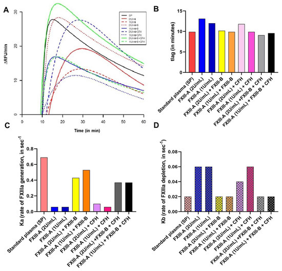 Effect of Complement Factor H (CFH) on FXIIIa generation. FXIIIa generation assay is a real-time, quantitative measurement of generation of active FXIIIa species, in a FXIII deficient background (deficient both for FXIII-A and FXIII-B subunits) [13]. The parameters tlag (time-delay in generation of first signal), Ka (constant of absorption that describes the rate of development of FXIIIa), and Kb (elimination constant) have been represented here. (A) Raw data obtained as growth curves representing the generation of active FXIIIa species. X-axis denotes time in minutes; Y-axis denotes the rate of generation of active FXIII-Aa (RFU/min). (B–D) are comparative bar graph representation of tlag, Ka and Kb observed with different spiking conditions. A tabular representation can be found in Supplementary Information.
