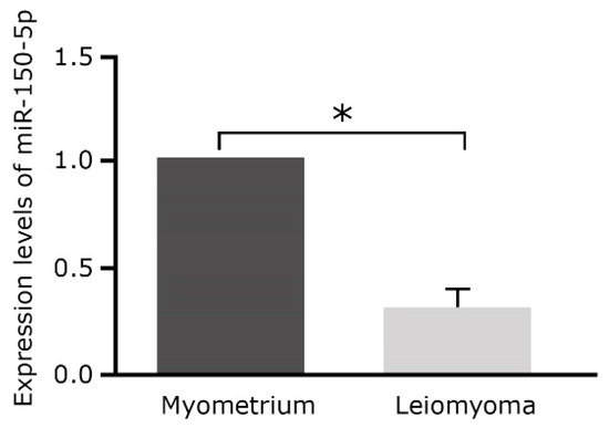 To confirm the miR microarray results, relative expression of miR-150 in uterine leiomyomas and matched myometrium was validated using qRT-PCR (Figure 1), which revealed that miR-150 expression levels were reduced 0.33 times in leiomyoma compared to myometrium (p < 0.01).