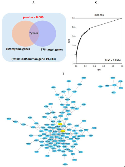 (A) Gene set analysis: predicted target genes of miR-150 contain 7 of the 109 previously known leiomyoma related genes. (B) In the STRING network model, the predicted target genes of miR-150 are forming modules of sufficient size. Akt and p27Kip1, the predicted target genes for miR-150 in this study, was shown in yellow. (C) In gene prioritization using the STRING network, the target genes of miR-150 were able to predict leiomyoma genes sufficiently and showed a high AUC prediction power (AUC-0.7994).
