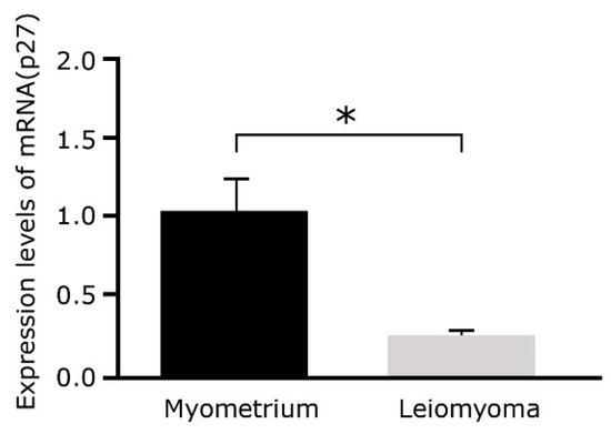 Expression of p27Kip1 mRNA was decreased 0.23 times in leiomyoma tissues (n = 7) compared to myometrial tissue (n = 7) according to qRT-PCR analysis (p < 0.01). qRT-PCR, quantitative real-time polymerase chain reaction. (* p < 0.01)