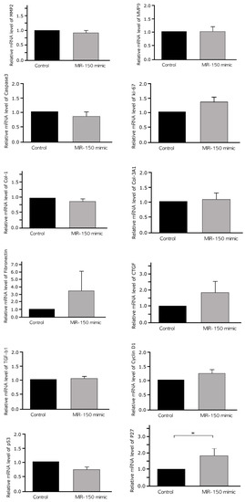 qRT-PCR analysis of mRNA levels of markers of invasion (MMP2 and MMP9), apoptosis (caspase 3), cell proliferation (Ki67), fibrosis (Col-1, Col3A-1, fibronectin, CTGF, and TGFβ-1), and cell cycle (cyclin D1 and p53) 48 h after transfection with the miR-150 mimic. mRNA levels of each sample were normalized to that of GAPDH expression (n = 7). qRT-PCR, quantitative real-time polymerase chain reaction; MMP2, matrix metalloproteinase-2; MMP9, matrix metalloproteinase-9; Col-1, collagen type 1; Col-3A1, collagen type 3 α1; CTGF, connective tissue growth factor; TGF-β1, transforming growth factor β1; p27Kip1, cyclin-dependent kinase inhibitor 1B; CCND1, cyclin D1; miR-150, microRNA-150-5p. (* p < 0.05).