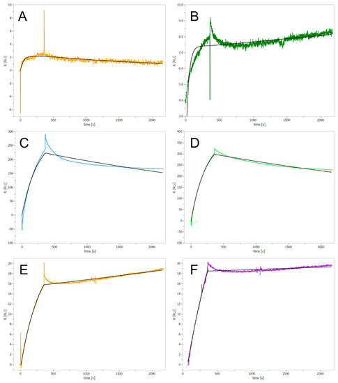 SPR sensorgrams of the ClpP inhibitors at 80 μM concentration. Each compound was injected over 7 min, followed by 30 min of dissociation time. (A) Bortezomib, (B) Cefmetazole, (C) cDPCP, (D) Cisplatin, (E) 3,4-DIC, and (F) Z-LY-CMK (covalent binder, control). The fitting curves of the SPR sensorgrams (black lines) were obtained using a 1:1 Langmuir interaction model.