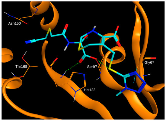 In order to evaluate the potential binding mode of cefmetazole in the active site of ClpP, the compound was docked into the X-ray crystal structure of the enzyme (Protein Data Bank ID 2FZS). Due to the experimentally-confirmed irreversible binding to ClpP, cefmetazole was docked with the β-lactam ring in the open conformation and covalently bound to Ser97 of the catalytic triad, which is the most frequent covalent interaction point for penem-class antibiotics [27]. The binding mode of the top-ranked docking pose within the active site showed several hydrogen bonds shared with the protein (Figure 3). Notably, the potentially reactive nitrile moiety is placed in close proximity to Thr168.