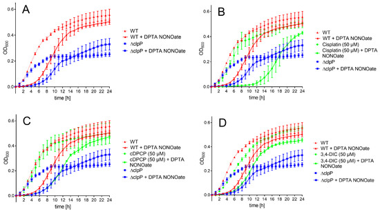 Bacterial growth curves of WT and ΔclpP E. coli strains in minimal media and in presence (solid lines) and absence (dotted lines) of DTPA NONOate (NO•). OD600 was measured in absence (A) and presence of 50 μM (B) cisplatin (C) cDPCP and (D) 3,4-DIC. Each value represents the mean of three independent experiment ± standard deviation.