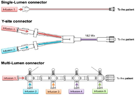 - Wedekind, C.A.; Fidler, B.D. Compatibility of commonly used intravenous infusions in a pediatric intensive care unit. Crit. Care Nurse 2001, 21, 45–51. [Google Scholar]