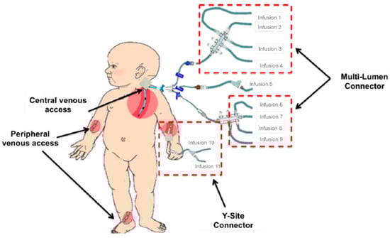 - Gaetani, M.; Frndova, H.; Seto, W.; Parshuram, C. Concurrent intravenous drug administration to critically ill children: Evaluation of frequency and compatibility. J. Crit. Care 2017, 41, 198–203. [Google Scholar] [CrossRef]
