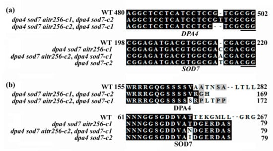 CRISPR/Cas9 Genome editing is able to generate transgene-free mutant plants [39,40,41,42], we thus used CRISPR/Cas9 to edit DPA4 and SOD7 in the aitr256 triple mutants. Two independent Cas9-free homozygous mutant lines, i.e., dpa4 sod7 aitr256-c1 and dpa4 sod7 aitr256-c2 were generated. In both lines, a single nucleotide insertion or deletion was occurred for DPA4 and SOD7 (Figure 1a to a few amino acid substitutions and premature stops for DPA4 and SOD7, respectively (Figure 1b).