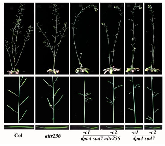 Inflorescence architecture in the dpa4 sod7 aitr256 quintuple and the dpa4 sod7 double mutants. Seeds of the Col wild type, the aitr256 triple, the dpa4 sod7 aitr256 quintuple and the dpa4 sod7 double mutants were generated and grown in soil pots for 30 days with sufficient watering. Pictures for inflorescences were taken from 7-week-old plants, for siliques were taken from 6-week-old plants. Upper panel, inflorescences of 7-week-old plants, middle panel, siliques arrangement on the main inflorescence stems, lower panel, 8th siliques on main inflorescence stems.
