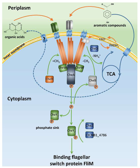 According to the well-studied enteric bacteria E. coli and Salmonella enterica, typical chemotactic responses start with signals generated by transmembrane chemoreceptors, also called methyl-accepting chemotaxis proteins (MCPs). Upon conformational changes of chemoreceptors, the phosphotransfer starts from histidine kinase CheA to response regulator CheY [15]. Phosphorylated CheY interacts with the flagellar switch protein FliM and, as a result, reverses flagellar rotation [40]. The chemotactic proteins phosphatase CheZ [41], methyltransferase CheR [42], and methylesterase CheB [43] contribute to signal termination and adaptation. C. testosteroni has a dozen predicted chemoreceptors, one histidine kinase, two response regulators, and also has phosphorylation and methylation systems.
