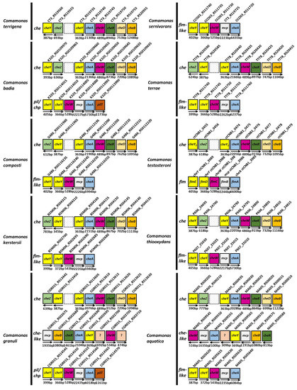 With this knowledge of C. testosteroni, we explored other Comamonas genomes for che and che-like gene clusters (Figure 4). We found that nine of the 11 Comamonas genomes have che clusters, and they have consistent components and similar genetic organization to the che cluster of C. testosteroni CNB-1. We also found that six of the 11 Comamonas genomes have gene clusters similar to the flm cluster of C. testossteroni CNB-1, suggesting that coordination of chemotaxis and biofilm formation might occur also in other Comamonas species. Interestingly, we observed that some of the che-like clusters of C. badia and C. granuli have annotated pilTs, of which the production is a Tfp pilus assembly protein and can regulate twitching motility, and other components are consistent with the flm cluster. Some additional che-like clusters that have different genetic organization to C. testosteroni CNB-1 clusters were observed in C. granuli and C. aquatica genomes, respectively (Figure 4). So far, the functions of these additional che-like clusters are still unknown.