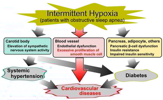 Obstructive sleep apnea (OSA) is characterized by repeated episodes of intermittent hypoxia (IH), i.e., transient oxygen (O2) desaturation, and resaturation. In clinical practice, OSA is commonly diagnosed by polysomnography and its severity is classified by the apnea hypopnea index (AHI) as follows: mild, AHI ≥5; moderate, AHI ≥15; severe, AHI ≥30 [,]. It is a highly prevalent disorder [,]; Peppard et al. estimated that the prevalence of moderate to severe sleep-disordered breathing is 10% and 3% among 30- to 49-year-old men and women, respectively, and 17% and 9% among 50- to 70-year-old men and women, respectively []. Furthermore, OSA is well known as a risk factor for diabetes, systematic hypertension, and cardiovascular diseases [,,,,,,,,,,,], and also increases mortality from cardiovascular diseases (Figure 1) [,].