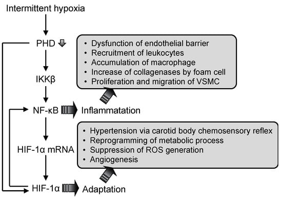Model of the hypoxia-inducible factor (HIF)-1 and nuclear factor (NF)-κB activation mechanisms in response to intermittent hypoxia (IH). IH-induced hypoxic condition decreases PHD activity. As a result, NF-κB is induced to activate via the activation of I-κB kinase-β (IKKβ), which activates both the NF-κB mediated inflammation pathway and the NF-κB mediated up-regulation of HIF-1. Activation of NF-κB and HIF-1 induces inflammation and adaptation to IH, resulting in angiogenesis via the proliferation and migration of VSMC. PHD: prolyl hydroxylases.