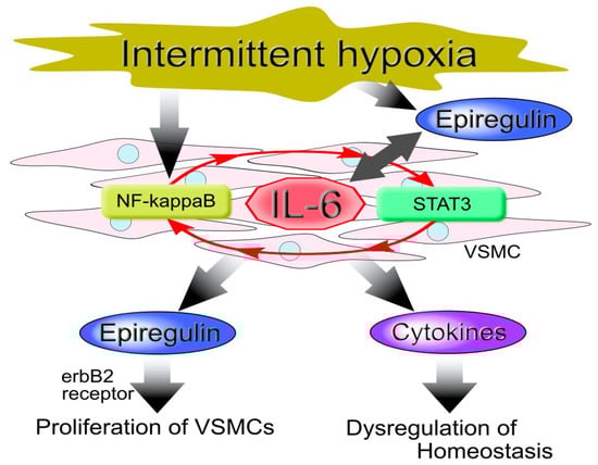 Model of vascular smooth muscle cell (VSMC) cellular responses to intermittent hypoxia (IH). IH induces the up-regulation of interleukin (IL)-6 via activation of the nuclear factor (NF)-κB and the signal transducer and activator of transcription 3 (STAT3), which involves the IL-6 amplifier (red arrow). This results in an increased expression of epiregulin and other cytokines that proliferate VSMCs, leading to atherosclerosis.