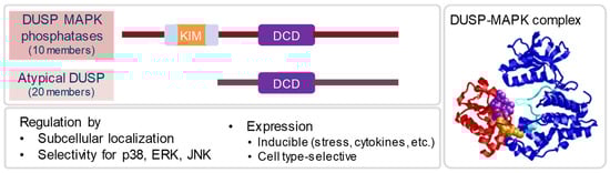 The specificity of the 10 members of this group for distinct MAPK family members is due to the presence of an N-terminal MAPK-binding domain (MKB) containing a kinase-interaction motif (KIM) (Figure 1). While DUSP6/MKP-3 specifically binds to and dephosphorylates extracellular signal-regulated kinases (ERK)1/2, but not p38 and JNK, DUSP10/MKP-5 binds and inactivates p38, but not ERK1/2, whereas DUSP1/MKP-1 can interact and dephosphorylate ERK1/2, p38 and JNK. Of note, substrate preferences for distinct MAPK in vivo are not always predicted by in vitro binding and catalytic activation studies. The KIM contains positively charged arginine residues which are essential for the specific interaction with the MAPK. As excellently reviewed by Caunt and Keyse [], the structural details of the binding interactions between DUSP-MKPs and their MAPK partners differ and can explain the specific activities for MAPK family members. Importantly, for some DUSP-MKPs (e.g., DUSP1/MKP-1, DUSP4/MKP-2 and DUSP6/MKP-3), the catalytic activity robustly increases as a consequence of a conformational change in the DSP domain, whereas this is not the case for DUSP5, DUSP10/MKP-5 and DUSP16/MKP-7 [].