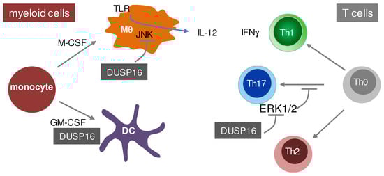 Two labs have made use of an ES cell line with an insertion of a β-Galactosidase/Neomycin gene-trap in the fourth intron of the DUSP16 gene to generate DUSP16-deficient mice. Consistently, these mice died in the perinatal period for an as yet unknown reason [,]. Recently, it was demonstrated that DUSP16 deficiency in these gene-trap mice strongly enhances cell death in sensory neurons upon NGF withdrawal in vitro and a loss of sensory innervations in DUSP16-deficient embryos in vivo []. Moreover, DUSP16-deficient embryos develop hydrocephalus due to expansion of neural progenitors and blockade of cerebrospinal fluid circulation through the midbrain aqueduct []. The generation of radiation chimeras showed a largely normal reconstitution of the hematopoietic system by DUSP16-deficient homozygous gene-trap fetal liver cells and allowed the characterization of the role of DUSP16 in immune cells. DUSP16-deficient CD4+ T cells have a cell-intrinsic defect in Th17 polarization, whereas IFNγ-producing Th1 cells and IL-4-producing Th2 cells are not affected []. This effect is dependent on increased ERK1/2 MAPK activation in DUSP16-deficient T cells following TCR triggering, as the MEK1-inhibitor U0126 restored Th17 differentiation []. Analysis of innate immune activation by the TLR4 ligand LPS showed a largely comparable cytokine and chemokine output as in WT mice, with the exception of IL-12p40 which was overproduced in DUSP16-deficient mice in vivo, an effect that could be attributed to macrophages, but not DC, in vitro and was dependent on JNK activity []. Together, the data in the DUSP16 gene-trap mice indicate important cell type-specific roles of this MKP in the proliferation, differentiation and cytokine response of macrophages, DC and T cells (Figure 4). However, the perinatal lethality of the DUSP16 gene-trap mice and the need to generate radiation chimeras impede the straightforward experimental analysis. In addition, the expression and function of DUSP16 in multiple immune cell types can result in complex phenotypes. Therefore, the generation of conditional DUSP16 knockout mice is needed to overcome these obstacles and to investigate the cell type-specific functions of DUSP16 in detail.