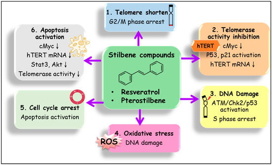 Robust scientific evidence demonstrates that stilbene compounds are capable of suppressing oxidative stress and inflammation as well as modulating senescence, apoptosis, autophagy, and cell cycle arrest. Cancer senescence can be triggered by various stimuli such as DNA damage, telomerase inactivation, and permanent cell cycle arrest. This suggest that stilbene compounds have the potential to induce senescence through the inhibition of telomerase activity in cancer cells. The complex relationship between telomeres/telomerase at the different levels of the regulation of telomerase activity and their relationship with associated proteins suggests that these associated proteins could be excellent targets in the fight against cancer [163]. However, most studies have focused on RSV, and only limited research has been carried out with other stilbene compounds, such as PIC and PT, which may have higher biological activity and deserve more scientific attention [135].