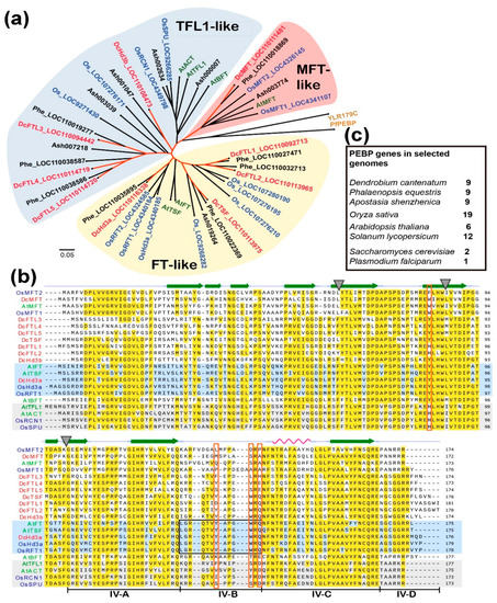 The nine FT/TFL1 proteins encoded by the phosphatidylethanolamine-binding protein (PEBP) gene family in the Dendrobium cantenatum genome. (a) A phylogenetic tree of FT proteins from D. cantenatum (highlighted in red), Arabidopsis thaliana (highlighted in green), and other species. Only selected FTs from Oryza sativa (Os, in blue), Phalaenopsis equestris (Phe), and Apostasia shenzhenica (Ash) are included; (b) sequence alignment for motif comparisons. The secondary structures are indicated at top of the alignment; the conserved exon boundaries are marked by triangles. The four segments (A, B, C, and D) of the fourth exon important for ligand binding and protein–protein interaction in FT/TFL1, as revealed by Ahn et al., 2006, are line-labeled under the sequences. Known activator FTs and repressor TFL1-like proteins are shaded with light-blue and light-gray, respectively. Red-boxed residues correspond to positions at 85, 134, 138, and 140 for AtFT, and the black-boxed residues denote the highly conserved fragment B in inducer FTs but divergent in the repressor TFLs [7,43]; (c) numbers of PEBP genes identified by BLAST survey in some plant species and the single-cell eukaryotes.